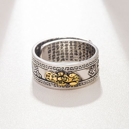 Pixiu Mantra Protection Wealth Ring Adjustable Retro Thai Silver Golden Toad Heart Sutra Ring Punk Feng Shui Rings for Women Men